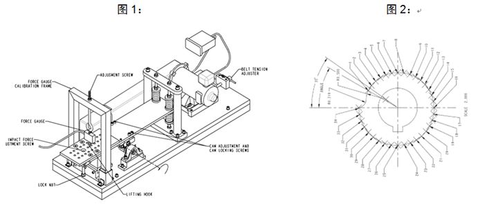 测试装备如下图1所示,其中凸轮如下图2所示。测试装备主要是由样品装置台、弹簧、凸轮、测力计等部分组成。测试要领为将车灯装置在测试试验台上,然后转动凸轮,在凸轮转动历程中,当凸出部分接触到上面的试验台时会发动装夹有车灯的试验台运行划定的位移,再当凸轮的凸出部分转离试验台时,会使试验台在笔直偏向上有划定距离的位移量。