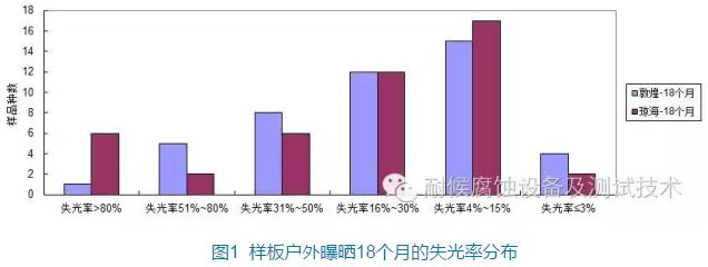 在敦煌曝晒场和琼海曝晒场划分曝晒18个月,样板的失光率漫衍和颜色转变漫衍情形见图1和图2。