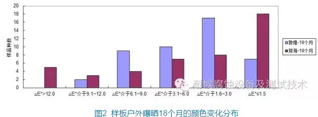由图2发明,参照GB/T 1766《色漆和清漆涂层老化的评级要领》,无论在哪个曝晒场,大部分样板属于稍微变色、很稍微变色,只有小部分样板属于显着变色和较大变色。